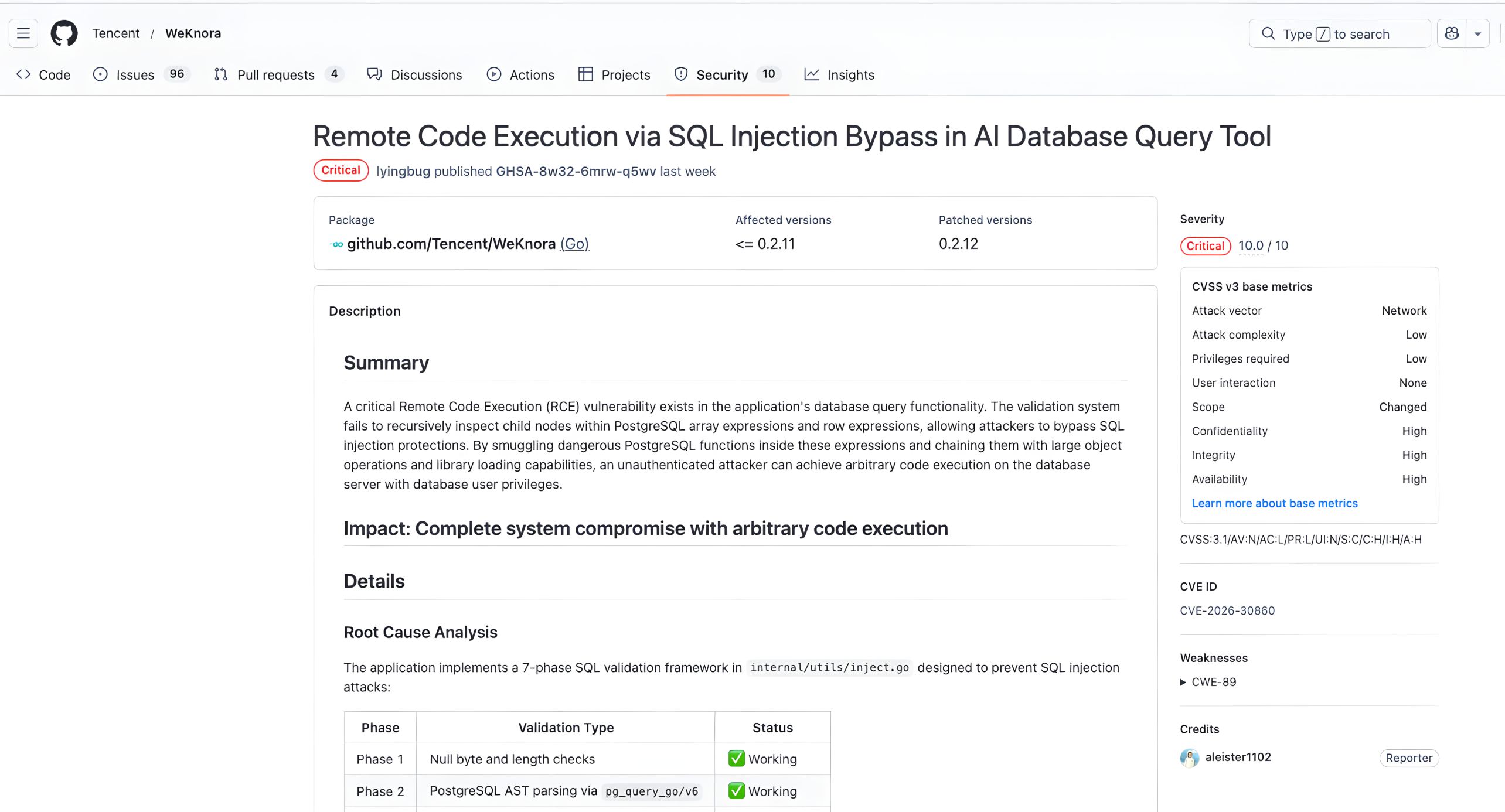 Among the eight disclosed vulnerabilities, CVE-2026-30860 stands out as one of the most technically significant. The issue affected WeKnora’s AI database query capability, where natural-language requests could be translated into SQL queries and executed against a connected PostgreSQL data source. In this workflow, the application attempted to enforce a defensive boundary through SQL parsing and AST-based validation before allowing execution. However, the implementation of that validation logic was incomplete.