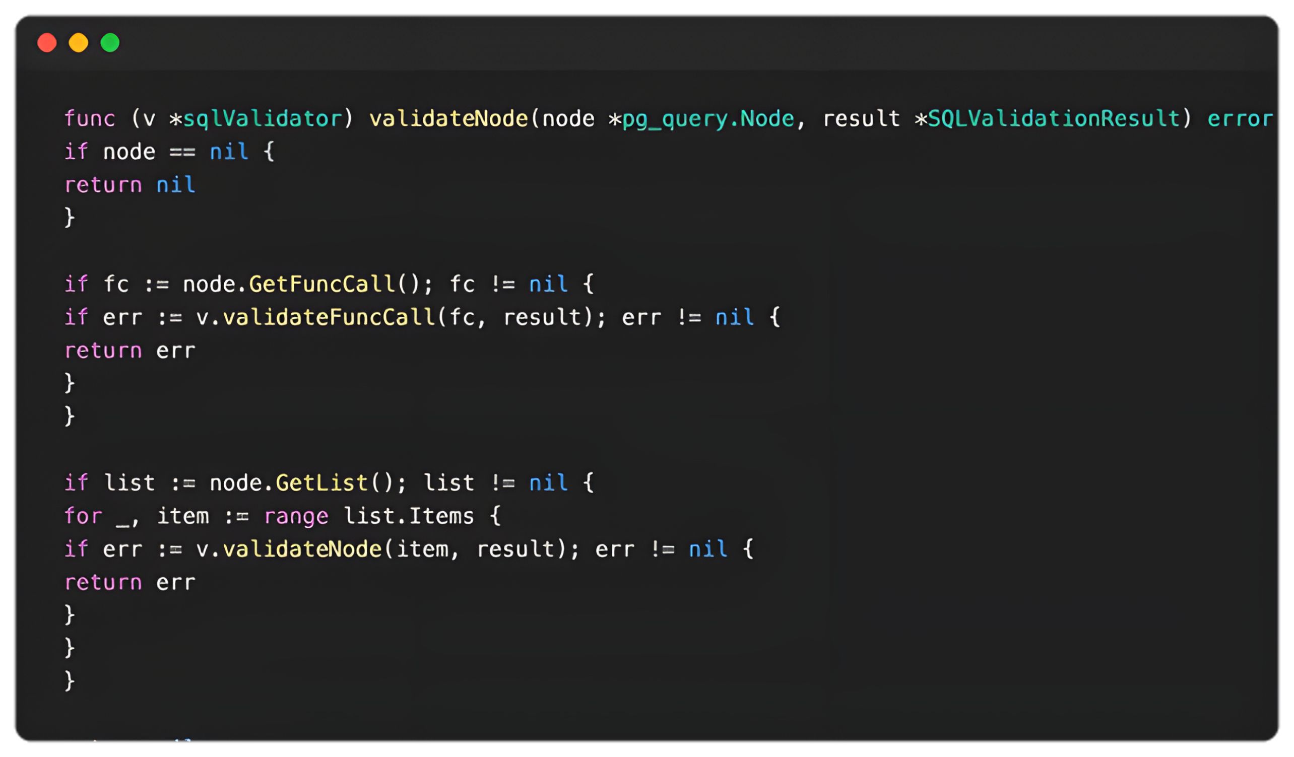 The pre-fix validateNode implementation in WeKnora v0.2.11 handled a long but incomplete list of PostgreSQL AST node types. It recursively descended into node types such as AExpr, BoolExpr, NullTest, CoalesceExpr, CaseExpr, ResTarget, SortBy, and List. However, after those explicitly handled branches, the function returned nil. Any container node that was not included in that traversal logic effectively became a blind spot, even if it still contained child expressions requiring validation.