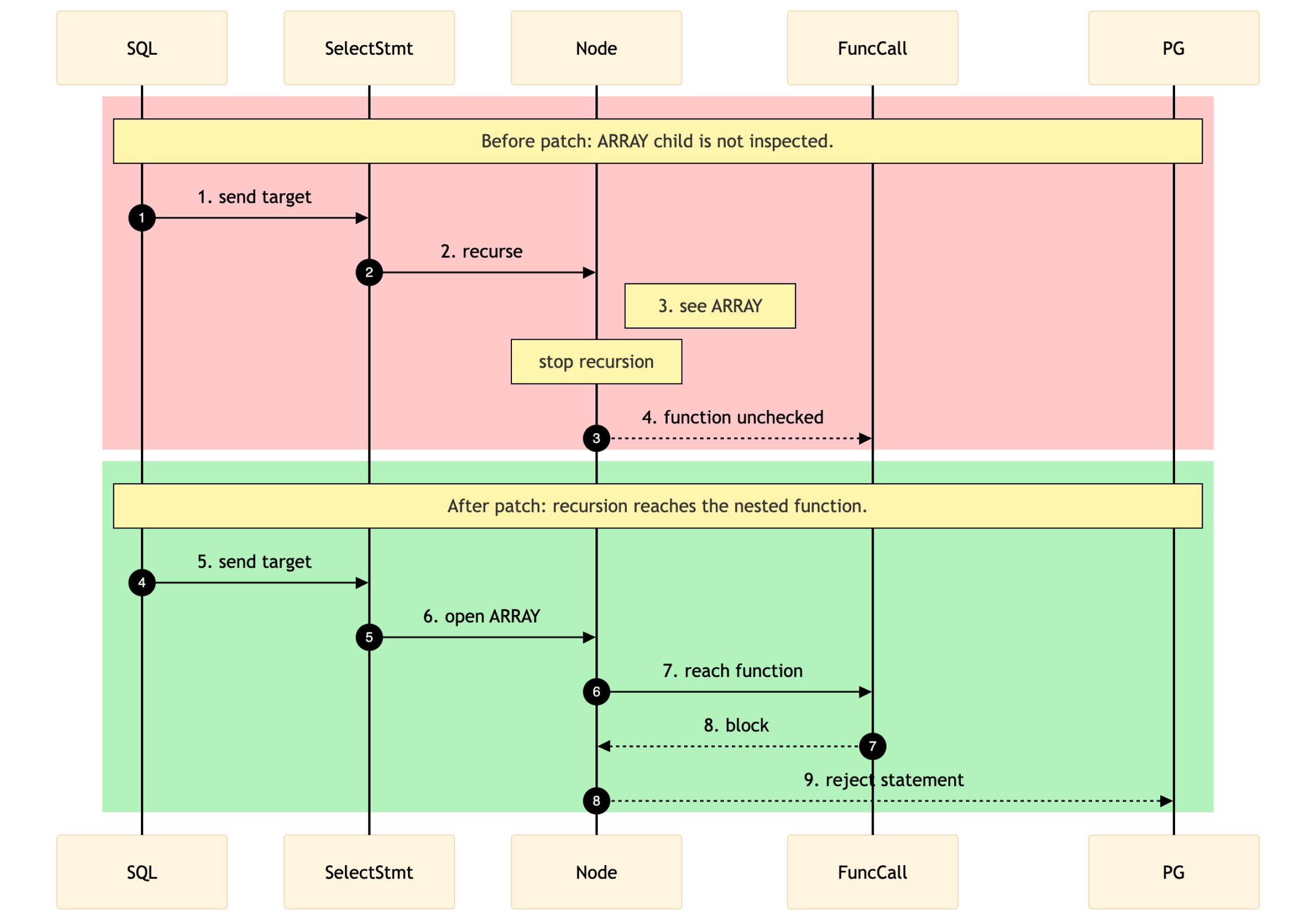 This detail was especially important for array and row expressions. These are not terminal nodes; rather, they are wrappers around additional expressions. If the validator does not recurse into those wrappers, nested FuncCall nodes never reach validateFuncCall, and the denylist for pg_* and lo_* functions is never applied.