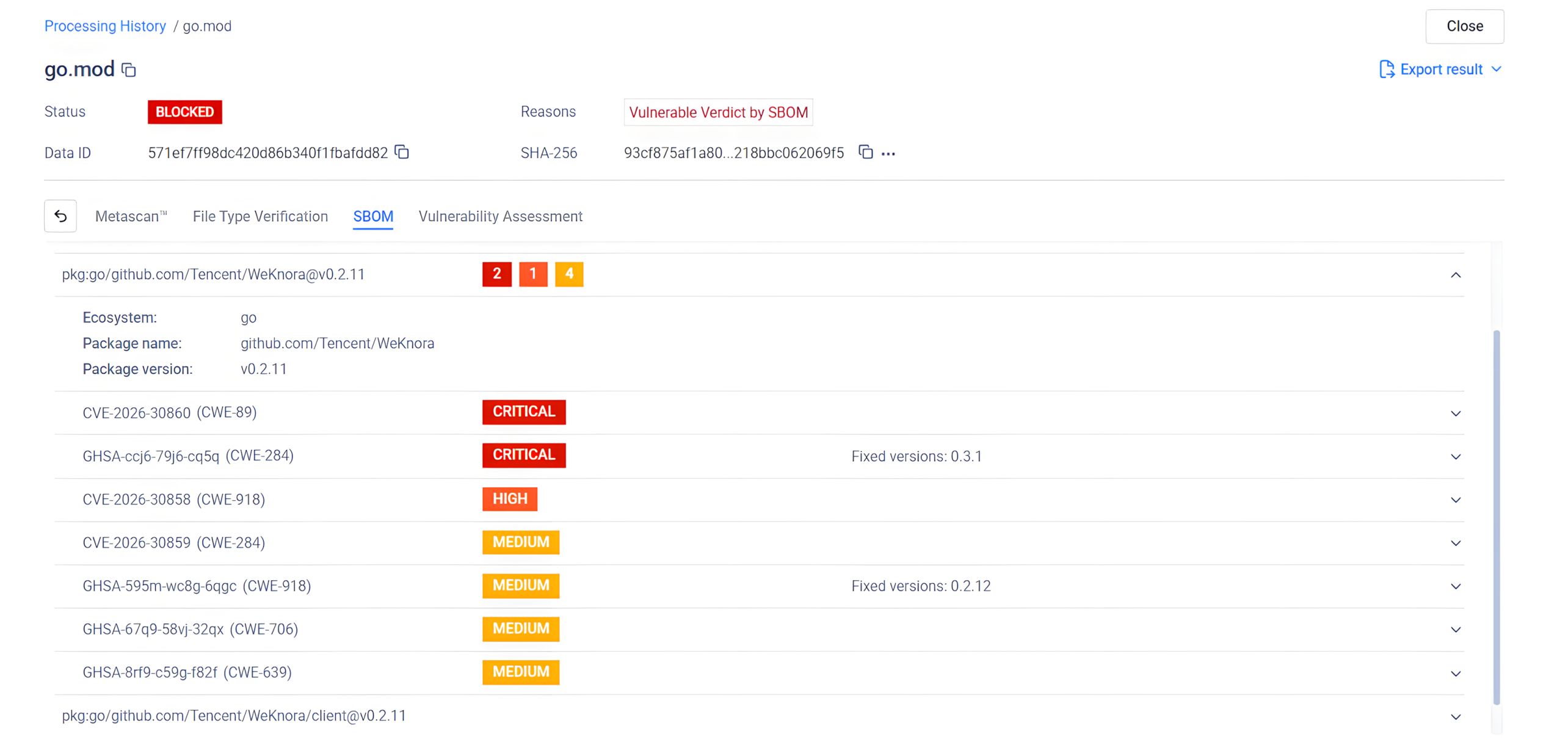 Below is a screenshot of CVE-2026-30860, CVE-2026-30861, CVE-2026-30855, CVE-2026-30856, CVE-2026-30857, CVE-2026-30858, CVE-2026-30859 and CVE-2026-30247, which were detected by MetaDefender Core with SBOM:
